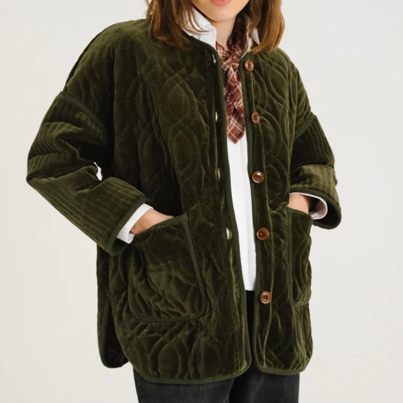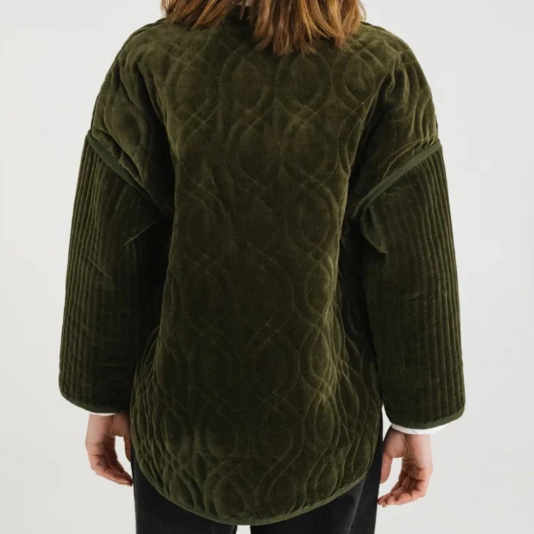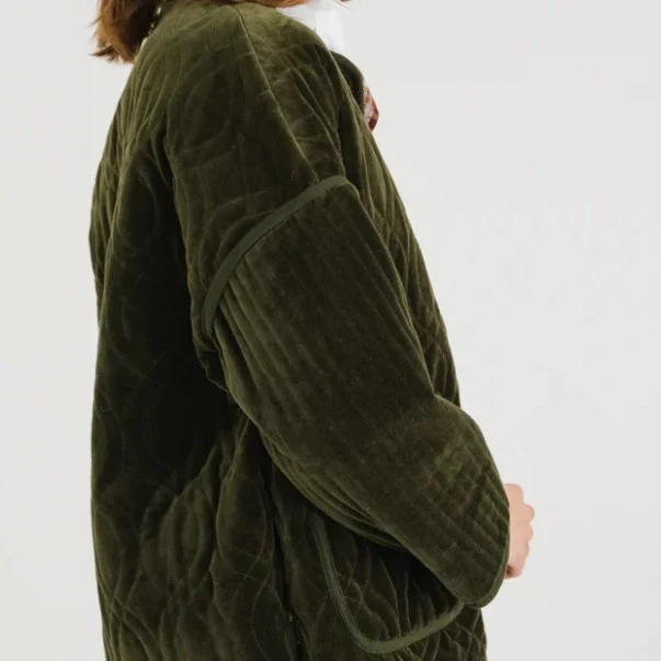 Veste mi-longue en velours ras matelassé kaki, à la coupe oversize et aux emmanchures basses. Sans col, elle se ferme par des boutons apparents et s’agrémente de deux poches plaquées sur le devant.