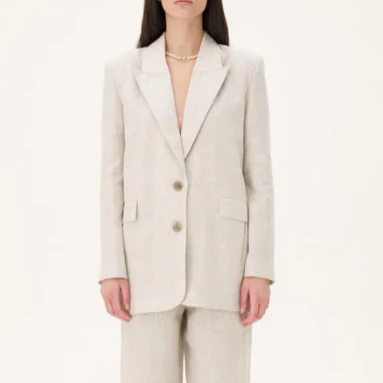 Veste blazer coupe droite, col tailleur pointu. Double poches avant, poche passepoilée incrustée dans une poche à rabat. Fente simple sur le côté. Fermeture par boutonnière avant. Boutonnière au poignet. Boutons en bio résine Composition : 100% lin certifié Oeko-Tex / Doublure 100% coton Fabriqué dans nos ateliers partenaires en Roumanie