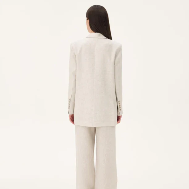 Veste blazer coupe droite, col tailleur pointu. Double poches avant, poche passepoilée incrustée dans une poche à rabat. Fente simple sur le côté. Fermeture par boutonnière avant. Boutonnière au poignet. Boutons en bio résine