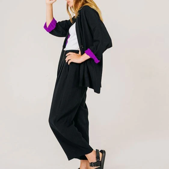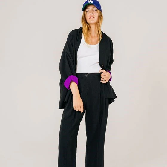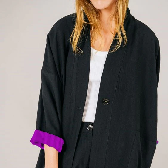 Légère comme une brise d’été, la veste loose esprit kimono flotte autour du corps avec nonchalance et grâce. Sa coupe ample libère les mouvements, son tissu fluide effleure la peau comme une caresse.