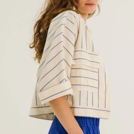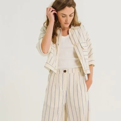 Confectionnée dans une toile authentique à rayures, mêlant coton et lin, cette veste allie tenue et légèreté pour un style casual-chic raffiné. Polyvalente, elle se porte facilement sur une robe ou avec un pantalon pour composer un look équilibré et contemporain.