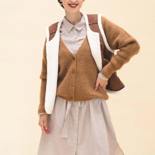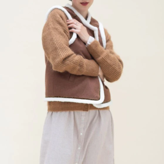 Veste courte réversible sans manches, col rond et coupe droite. Il y a 2 poches sur le devantC’est le must have de la saison. Composition : 90% laine, 10% soie Entretien : ne pas laver, pas de blanchiment, ne pas repasser, nettoyage à sec doux
