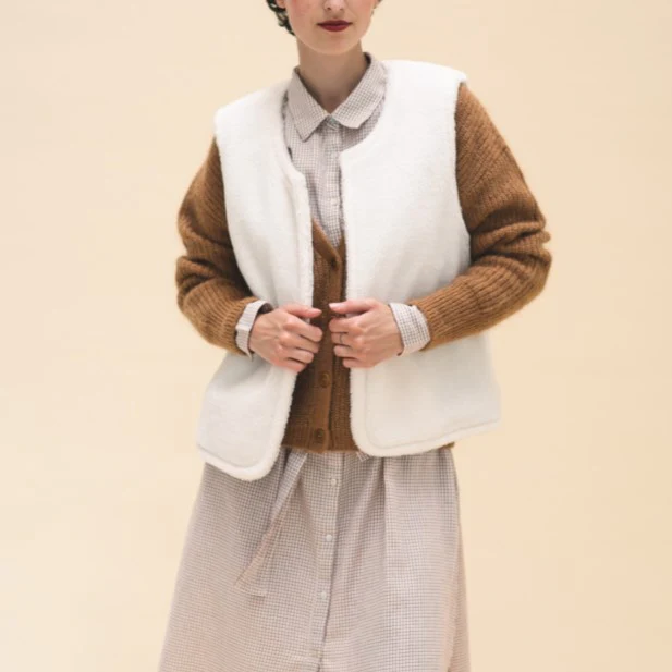 Veste courte réversible sans manches, col rond et coupe droite. Il y a 2 poches sur le devant