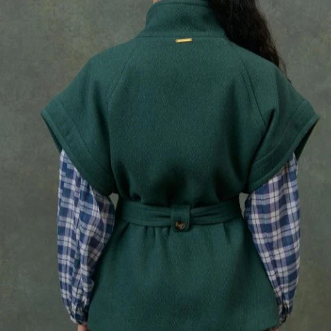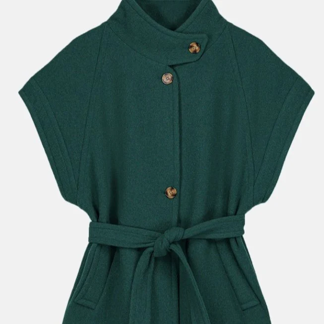 Cette veste oversize séduit par son col montant et sa fermeture à boutons pour un style contemporain et structuré. Les emmanchures basses et larges apportent confort et modernité, tandis que la ceinture avec passant au milieu du dos souligne subtilement la silhouette. Un bouton griffe doré au dos vient finaliser les détails raffinés de cette pièce.