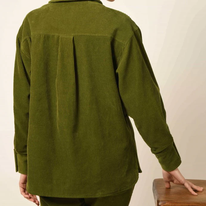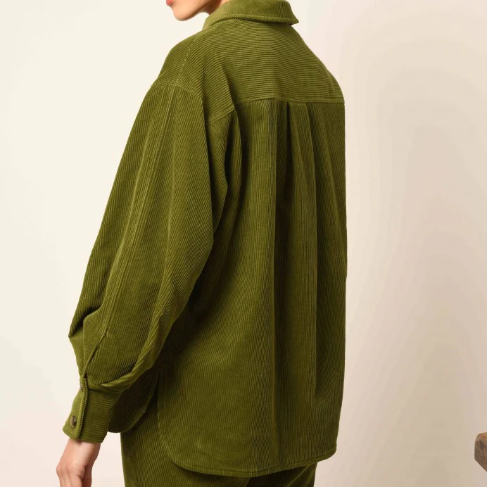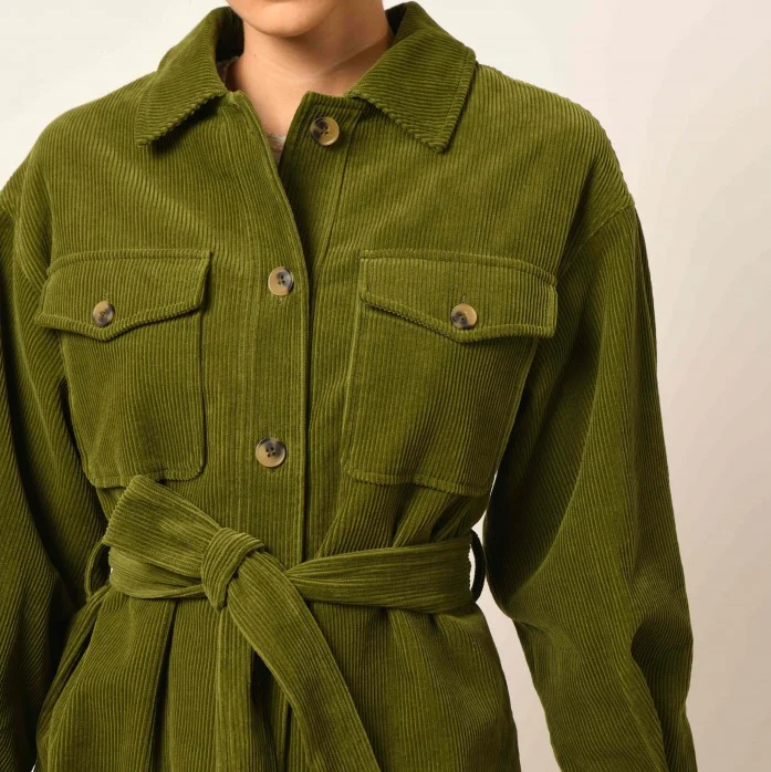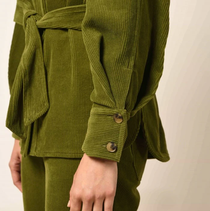 Veste couleur verveine, coupe droite en velours côtelé. Avec col chemise et boutonnage simple, cette veste chic est un véritable passe partout ! Elle peut se porter ceinturée, avec passant et ceinture amovible. La veste est fendue sur les côtés, l’arrière est légèrement plus long