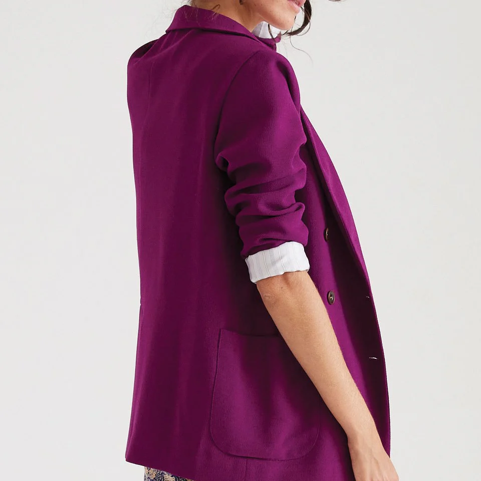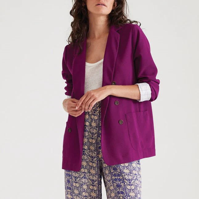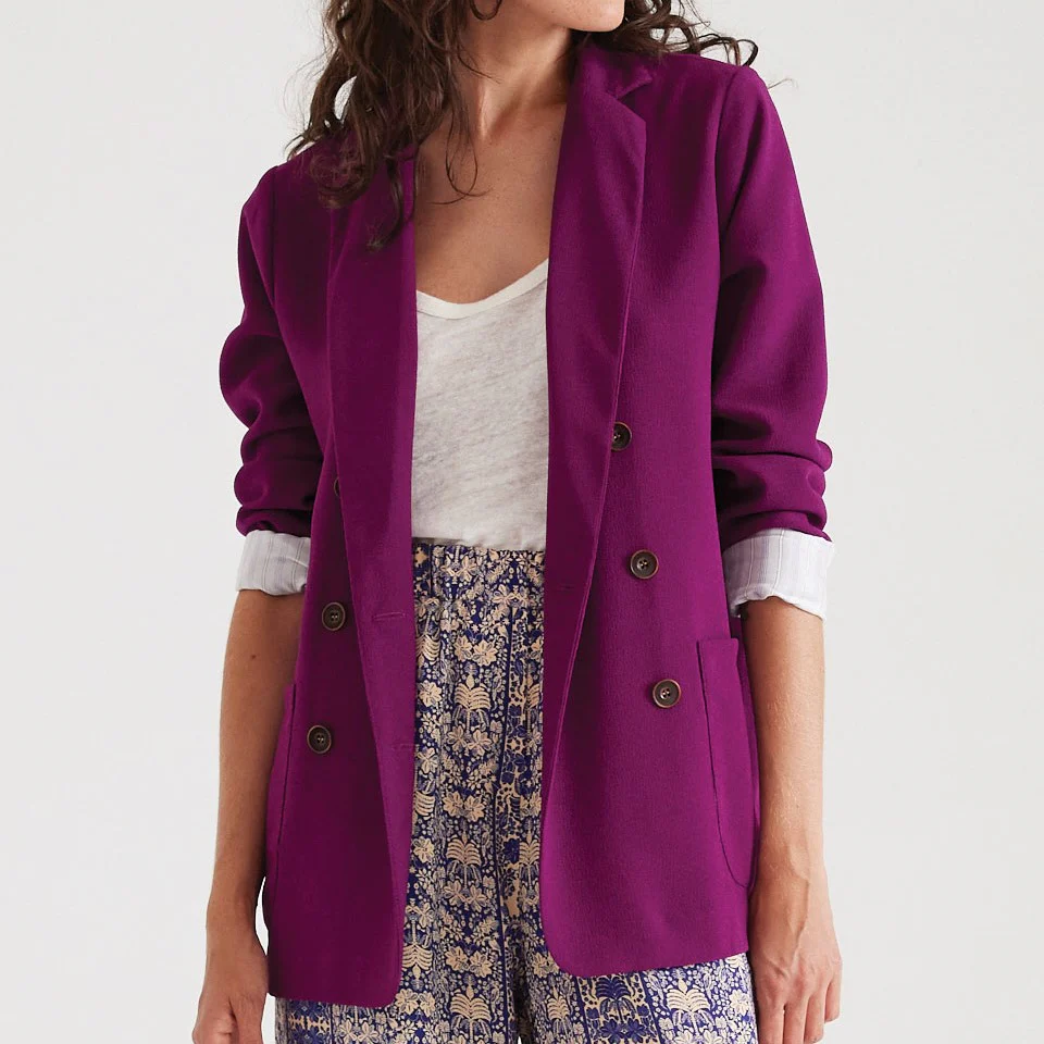 Veste tailleur souple et légère, semi doublée et gansé. Double boutonnage Matière française : crêpe fluide et féminin 98 % Polyester 2% Elasthanne, doublure 100% Viscose Lavage en pressing Fabrication en Tunisie