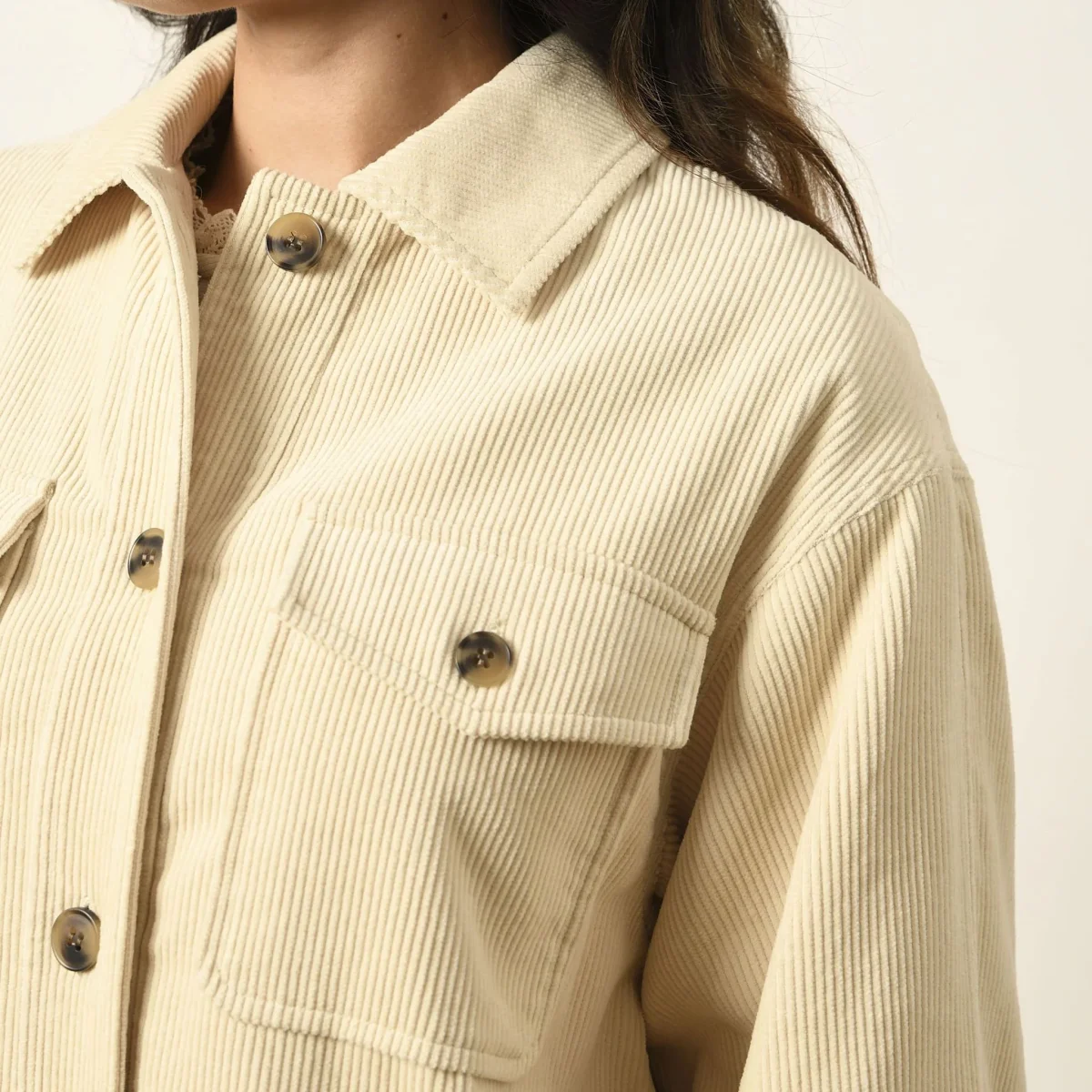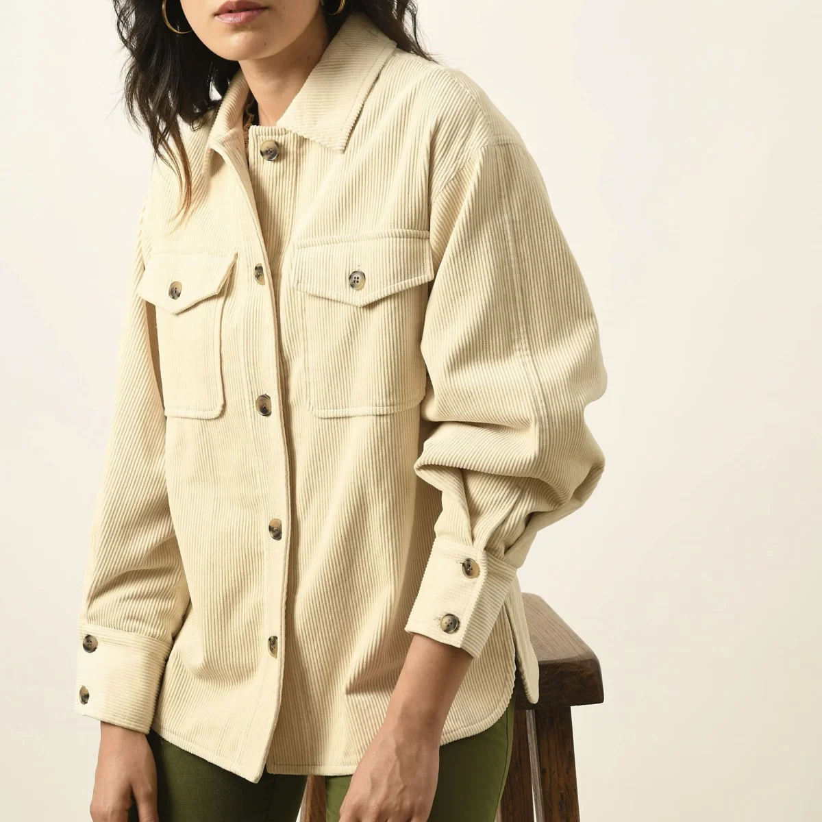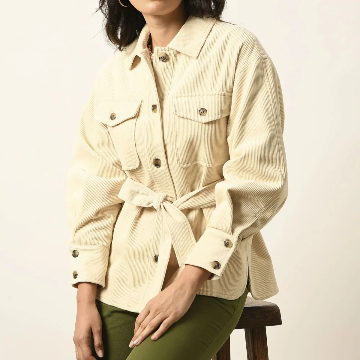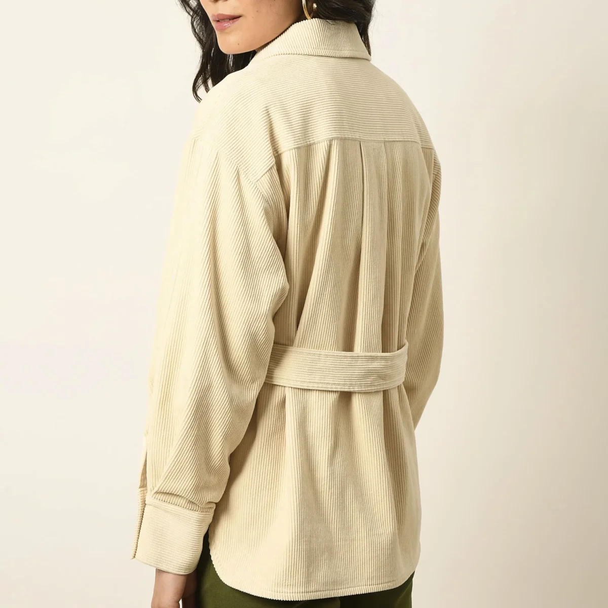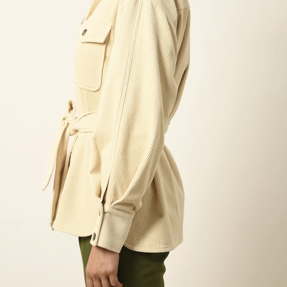 Veste écrue en velours côtelé, coupe droite, col chemise et boutonnage simple. On y trouve 2 poches à rabat sur la poitrine. Cette veste peut se porter ceinturée, avec passant et ceinture amovible. Fentes sur les côtés, et l’arrière est légèrement plus long.