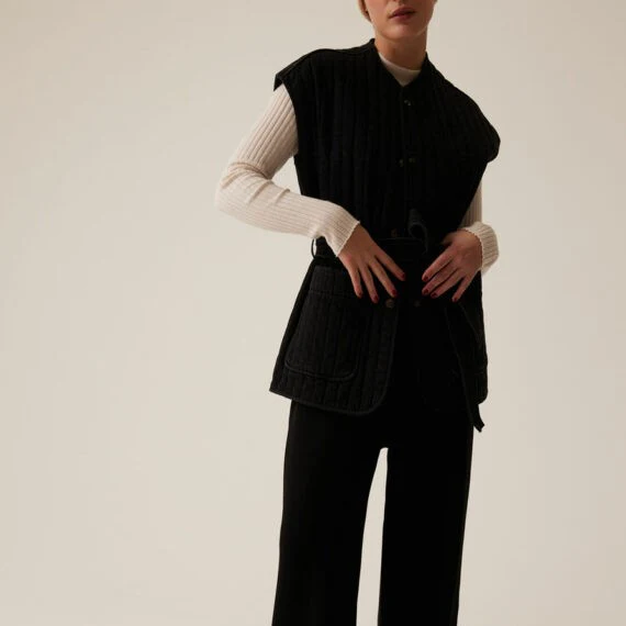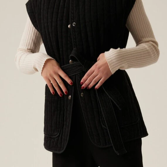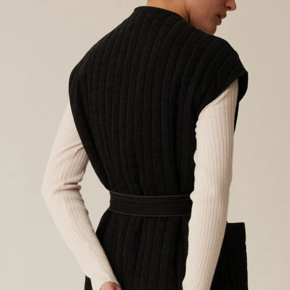 Gilet matelassé, boutonné sur le devant par des boutons pressions. Il se porte sur une chemise, une pull ou une robe. Il peut aussi être porté en sous-veste, sous un de nos manteaux. Ceinturé ou non, selon vos envies !